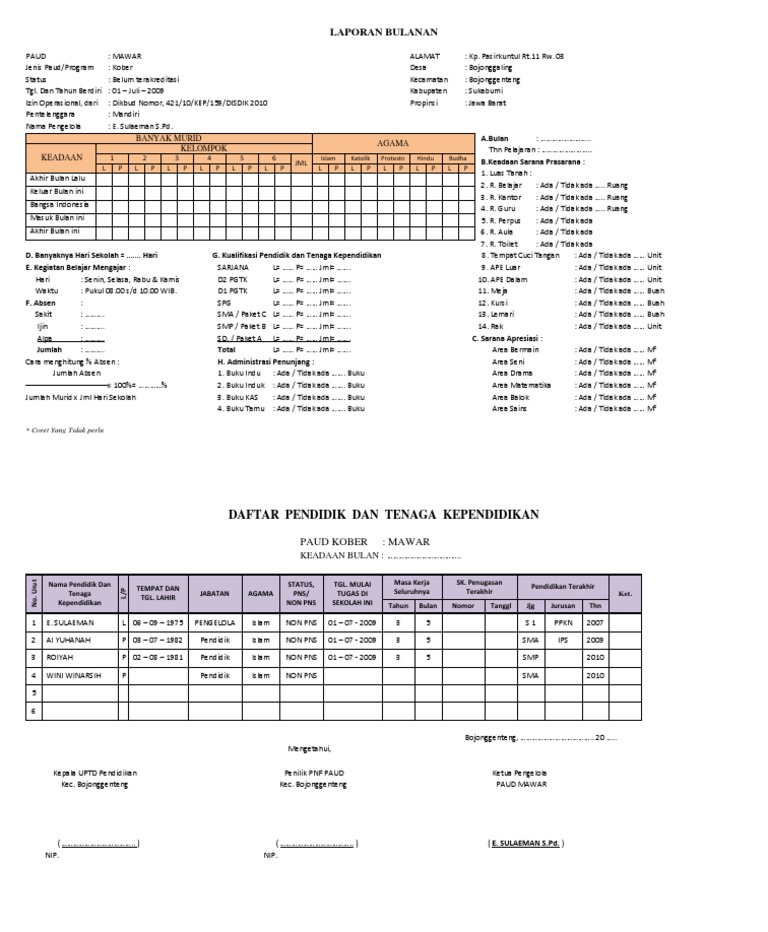 Laporan Bulanan Paud. Dikbud nomor, 421/10/kep/159/disdik 2010 : Aplikasi laporan bulanan sekolah 2017 berbasis microsoft excel program laporan bulanan merupakan suatu hal yang terpenting dalam proses administrasi sekolah, yang dalam hal ini selalu dibuat secara rutin yang menggambarkan administrasi sekolah itu sendiri.tentu haruslah lengkap dan jelas dalam pembuatannya. Format laporan bulanan sekolah versi microsoft excel digunakan sebagai aplikasi rekap data sekolah yang dilaporkan ke uptd pendidikan atau kabupaten/kota dalam setiap kali ada perubahan data. Panduan pengisian dhgtk absensi guru online. Get contoh laporan bulanan gugus paud 2021 2022 2023 images.berikut ini adalah arsip berkas contoh laporan bulanan paud terbaru. Contoh buku laporan bulanan tk/paud. Laporan bulanan online dinas pendidikan kepemudaan dan olahraga kabupaten kampar riau Laporan bulanan online kabupaten kampar. Simulasi pengisian spt tahunan pph badan 1771 lembaga paud tk ilmu net. Format laporan paud ini adalah format terbaru yang didapat dari berbagai sumber terpercaya jadi sangat cocok untuk dijadikan. Buku kas bulanan paud ini sangat penting bagi lembaga paud untuk membuat laporan keuangan, baik itu laporan pertanggungjawaban (lpj) maupun laporan keuangan tahunan (lkt). Contoh format excel laporan bulanan mingguan harian dan jadwal pelaksanaan untuk konsultan pengawas laporan pengawasan sangat penting untuk mengetahui progress di lapangan. Kumpulan contoh format buku administrasi laporan bulanan paud tk ra tahun ajaran 2016 2017 dengan microsoft word microsoft words. Inilah contoh laporan bulanan general affairs dan hal lain yang berhubungan erat dengan contoh laporan bulanan general affairs serta aspek k3 secara umum di indonesia. Ingin membuat laporan keuangan bulaan dengan excel?
