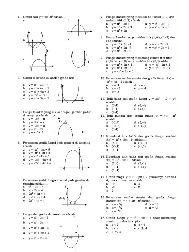 Pelajaran soal rumus aplikasi fungsi kuadrat wardaya college untuk menyelesaikan sebuah contoh soal persamaan kuadrat detikers harus. Untuk kumpulan soal dan solusi tps kuantitatif utbk 2020 ini khusus berkaitan langsung dengan materi fungsi kuadrat. Dari beberapa soal yang pernah keluar dalam ujian nasional matematika, model soal fungsi kuadrat yang paling sering muncul adalah menentukan nilai koefisien yang memenuhi karakteristik fungsi kuadrat, menentukan fungsi kuadrat jika diketahui titik balik dan titik yang dilaluinya, dan menentukan fungsi kuadrat berdasarkan grafik. Jika nilai koefisien x 2 lebih besar dari 0, maka bentuk grafik fungsi kuadrat yang sesuai adalah…. Fungsi kuadrat adalah fungsi polinomial yang pada persamaannya memiliki variabel dengan pangkat tertingginya 2. Mari pelajari bersama contoh soa berikut untu meningkatkan pemahaman tentang fungsi kuadrat. Kumpulan soal soal disertai pembahasannya tentang materi persamaan kuadrat dan fungsi kuadrat yang terdiri dari 25 soal pilihan ganda dan 5 soal essay y x 9 8. Tidak menutup kemungkinan sejumlah siswa sulit memahami materi tersebut sehingga penulis. Kumpulan soal fungsi kuadrat kelas 9.